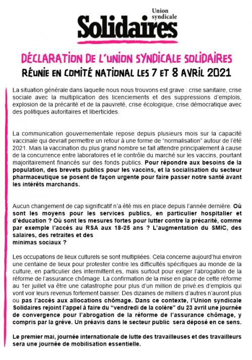 Le comité national de Solidaires réaffirme que des mesures d’urgences pour répondre aux crises sanitaires et sociales sont indispensables. Solidaires rejoint l’appel au 23 avril de lutte contre la réforme de l’assurance chômage. Le premier mai doit être une journée de forte mobilisation. Le comité national, face à l’urgence sociale et écologique, va proposer à l’ensemble du mouvement social d’organiser une grande journée de manifestation en septembre.