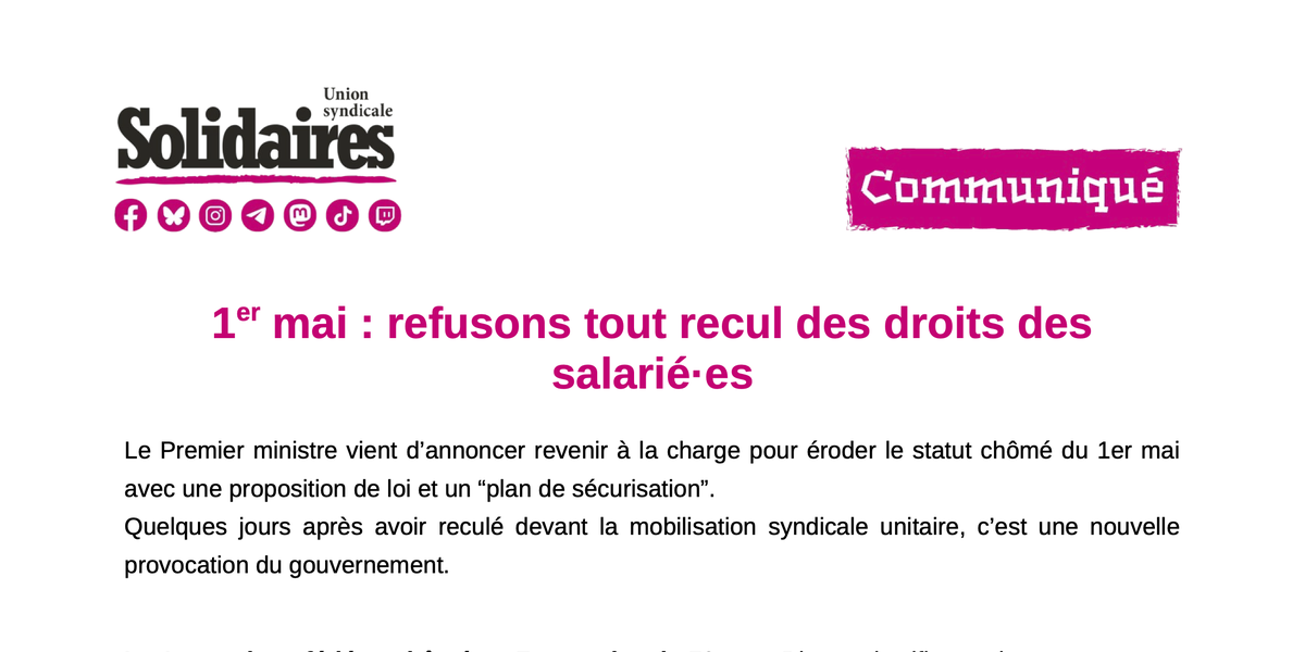 Face à ces attaques, l’Union syndicale Solidaires appelle à participer massivement aux manifestations du 1er mai !