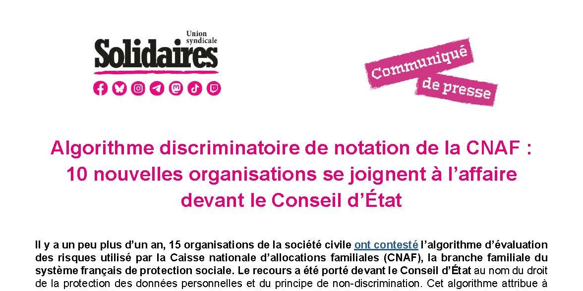 Aujourd’hui, notre coalition est fière d’accueillir 10 nouvelles organisations dans ce litige. Nous sommes désormais 25 à demander l’interdiction de l’algorithme de notation de la CNAF. La diversité de la coalition, qui rassemble des collectifs de personnes concernées, des syndicats ainsi que des ONG françaises et européennes de défense des droits fondamentaux, témoigne de la large opposition à l’algorithme de la CNAF et, plus largement, aux algorithmes discriminatoires visant les personnes vulnérables.