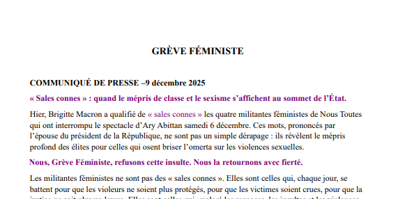 Hier, Brigitte Macron a qualifié de « sales connes » les quatre militantes féministes de Nous Toutes qui ont interrompu le spectacle d’Ary Abittan samedi 6 décembre. Ces mots, prononcés par l’épouse du président de la République, ne sont pas un simple dérapage : ils révèlent le mépris profond des élites pour celles qui osent briser l’omerta sur les violences sexuelles.