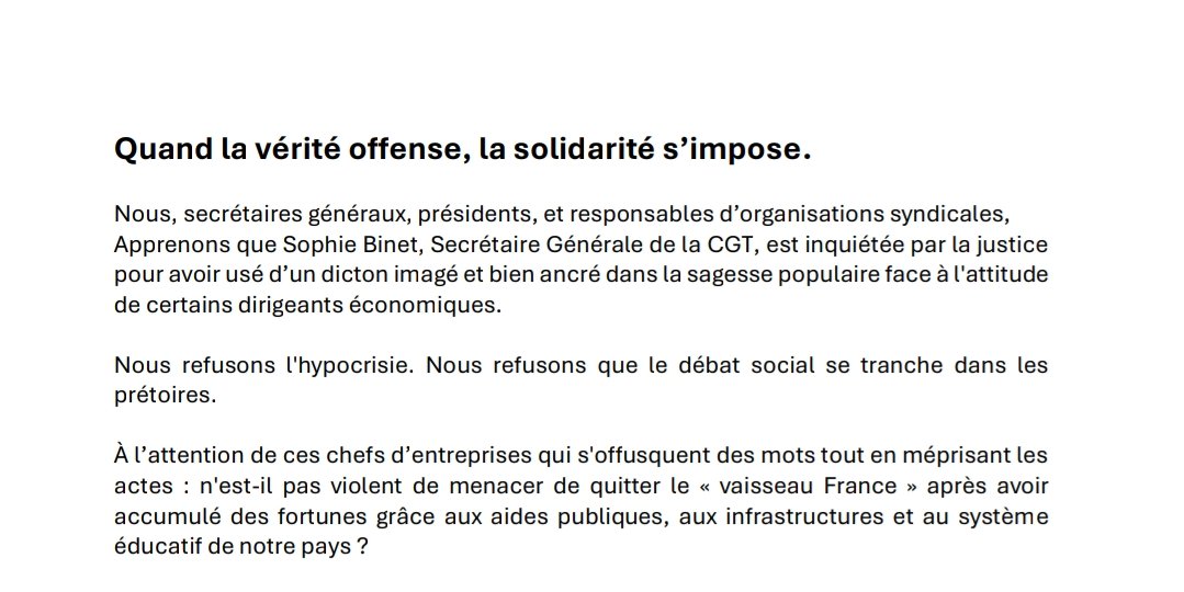 Nous, secrétaires générales, secrétaire généraux, président, co-déléguées, et responsables d’organisations syndicales, apprenons que Sophie BINET, Secrétaire Générale de la CGT, est inquiétée par la justice pour avoir usé d’un dicton imagé et bien ancré dans la sagesse populaire face à l’attitude de certains dirigeants économiques.
