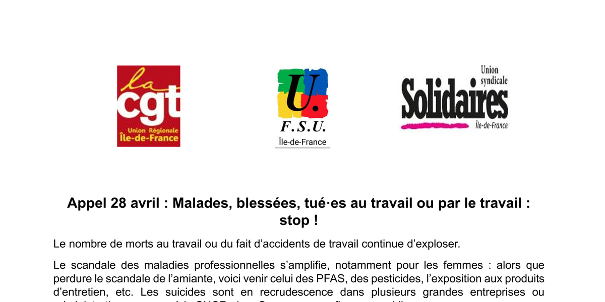 Le 28 avril, journée mondiale de lutte contre les accidents du travail et maladies professionnelles, manifestons partout pour exiger des employeurs privés et publics et du gouvernement la fin du scandale !