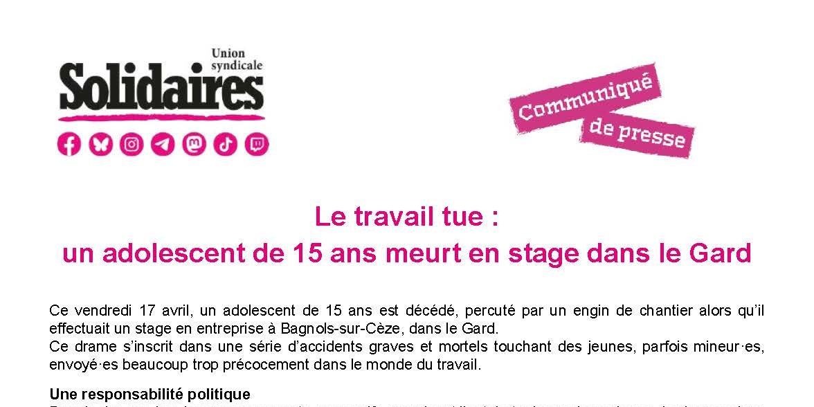 Chaque mort au travail est une mort de trop. Solidaires appelle à faire de ce drame un point de bascule : il est urgent de rompre avec un modèle qui banalise l’exploitation et met en danger la vie des travailleur·euses, en particulier des plus jeunes.