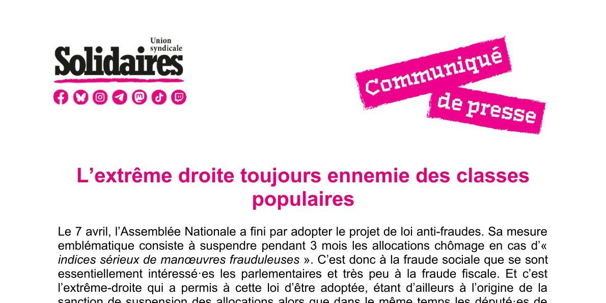Adopté par l’assemblée nationale, le projet de loi devrait faire l’objet d’une commission mixte paritaire pour être validé définitivement le 5 mai prochain. L’Union syndicale Solidaires exige que les pouvoirs publics se concentrent sur la lutte contre la fraude et l’évasion fiscale et mettent les moyens humains et matériels nécessaires. Car les conséquences de la fraude fiscale sont autrement plus graves que la fraude aux allocations. La fraude et l’évasion fiscale gangrènent les budgets notamment pour nos services publics de plus en plus incapables de satisfaire les besoins sociaux et paupérisent les classes populaires. L’ennemi, ce n’est pas le pauvre qui survit au jour le jour, c’est le riche et les grandes entreprises qui fraudent la collectivité.