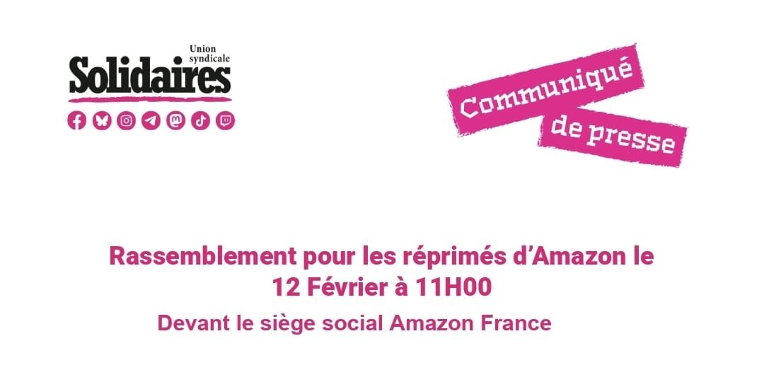 L’Union syndicale Solidaires appelle à un rassemblement le 12 février à 11h devant le siège d’Amazon France afin de dénoncer les sanctions, pressions et licenciements visant des salarié·es et représentant·es syndicaux engagés dans la défense de leurs droits.