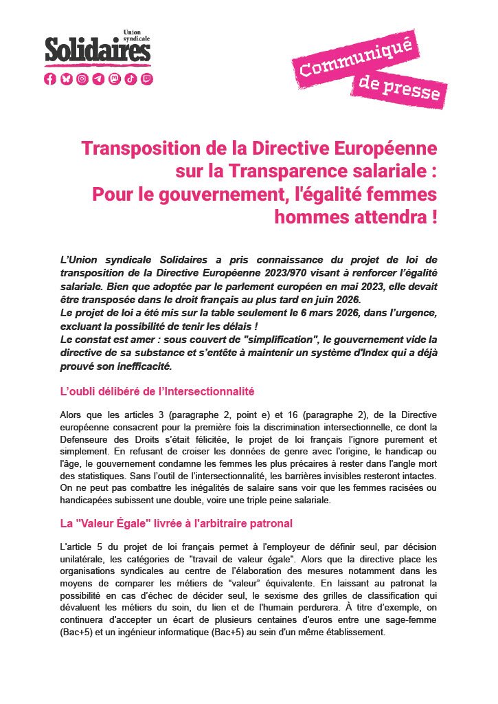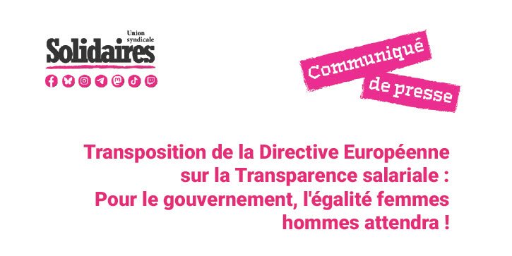 L’Union syndicale Solidaires a pris connaissance du projet de loi de transposition de la Directive Européenne 2023/970 visant à renforcer l’égalité salariale. Bien que adoptée par le parlement européen en mai 2023, elle devait être transposée dans le droit français au plus tard en juin 2026.