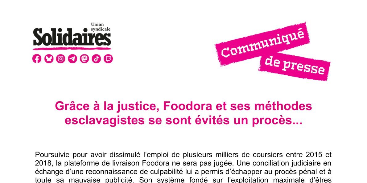 Il reste néanmoins aux ex-coursiers de Foodora la possibilité d’obtenir un dédommagement au civil en septembre prochain. L’Union syndicale Solidaires, organisation représentative des livreurs et livreuses des plate-formes, déplore profondément que par manque de courage (et certainement aussi de moyens) justice n’est pas été faite. Elle les soutiendra pour obtenir réparation. Solidaires considère enfin comme indispensable que soit mis un terme immédiat à ce système d’exploitation des travailleurs-euses de plateforme et que la directive européenne d’octobre 2024 présumant ceux-ci comme des salarié-es à part entière de ces entreprises soit transposée en droit français.