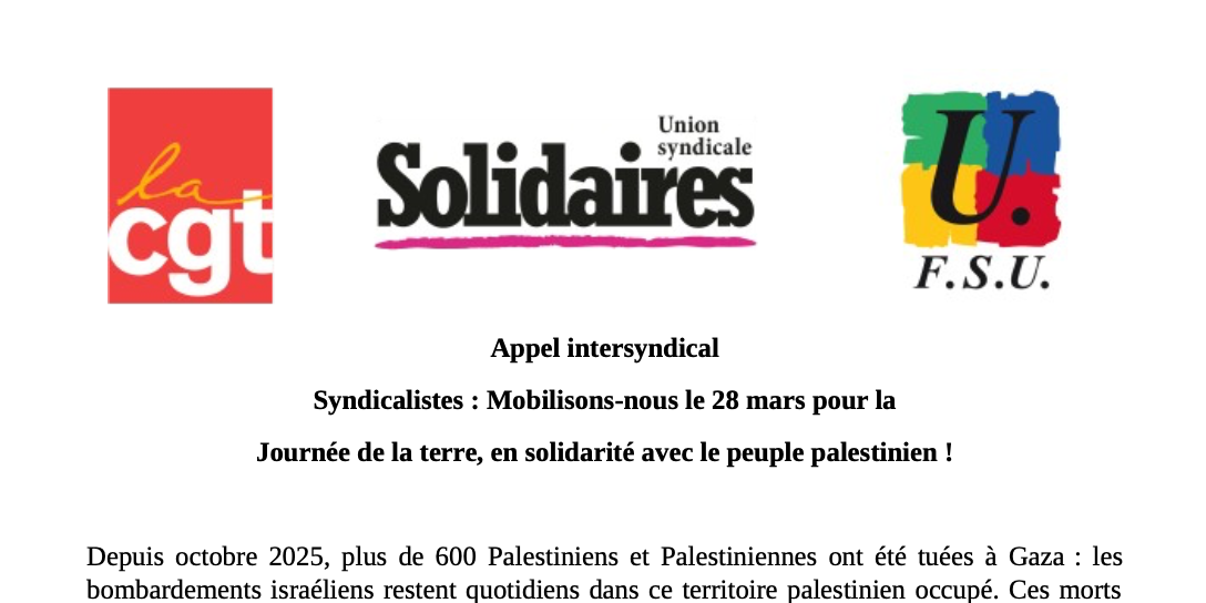 Nos organisations syndicales rappellent leur attachement internationaliste à une paix juste et durable, au respect du droit international et au droit des peuples à l’autodétermination. Elles appellent à se mobiliser et à rejoindre les manifestations dans toutes les régions françaises le 28 mars, à l’occasion de la Journée de la terre pour la défense des droits du peuple palestinien et exiger :