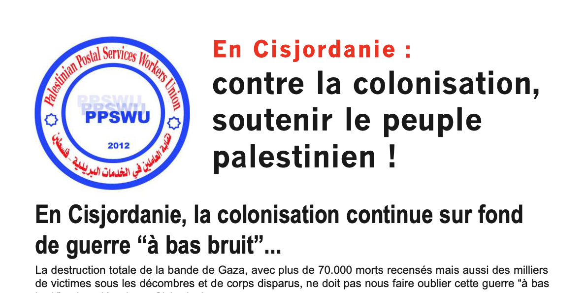 Vous pouvez aussi contribuer en remettant un chèque à un ou une militante ou en l’envoyant à la fédération SUD-PTT avec la mention : “ Solidarité Palestine PPSWU ”.