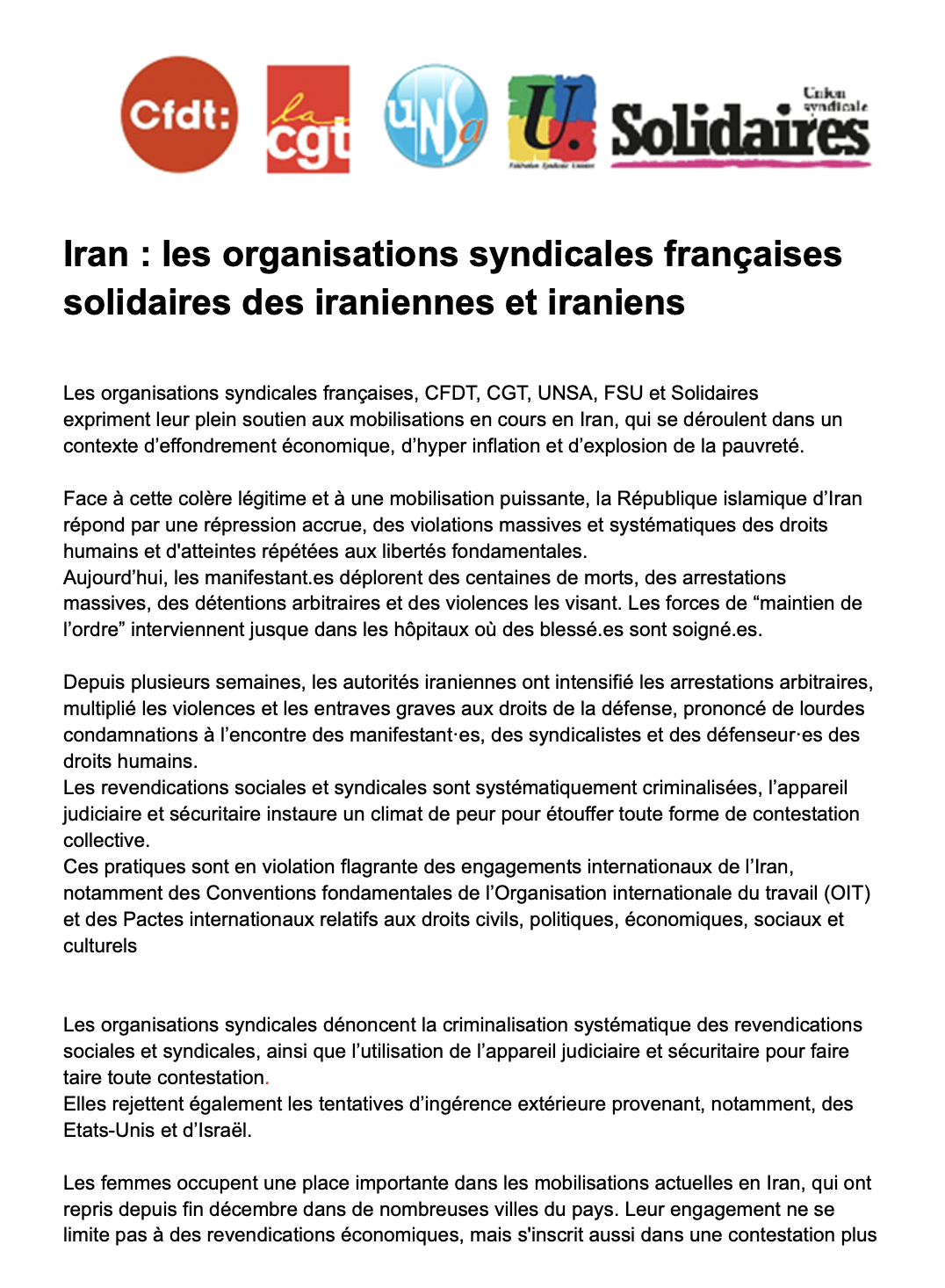 Les organisations syndicales françaises, CFDT, CGT, UNSA, FSU et Solidaires expriment leur plein soutien aux mobilisations en cours en Iran, qui se déroulent dans un contexte d’effondrement économique, d’hyper inflation et d’explosion de la pauvreté.