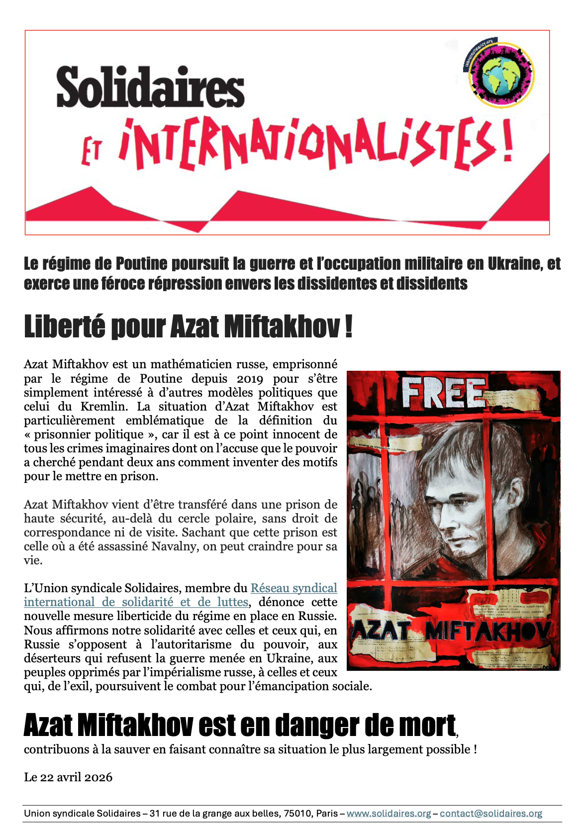 Nous affirmons notre solidarité avec celles et ceux qui, en Russie s’opposent à l’autoritarisme du pouvoir, aux déserteurs qui refusent la guerre menée en Ukraine, aux peuples opprimés par l’impérialisme russe, à celles et ceux qui, de l’exil, poursuivent le combat pour l’émancipation sociale.