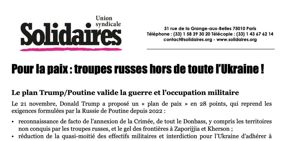 Depuis bientôt quatre ans, les Ukrainien·nes se battent pour la liberté de leurs choix. Ils et elles se battent aussi pour leurs acquis et droits sociaux et contre la corruption. Ce sont ces syndicats, associations, collectifs féministes, de jeunes, écologistes, LGBTQI+, que le comité français du Réseau européen de solidarité avec l'Ukraine, dont l’Union syndicale Solidaires est membre, soutient dans leurs luttes quotidiennes et contre l’envahisseur russe. Une paix juste et durable doit prendre en compte les exigences du peuple ukrainien et c'est à l'Ukraine, avec l'appui de ses alliés, de la négocier.