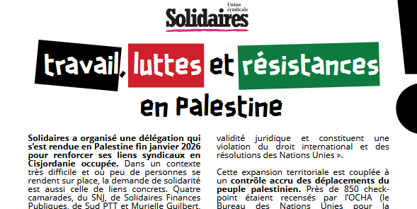 Solidaires a organisé une délégation qui s’est rendue en Palestine fin janvier 2026 pour renforcer ses liens syndicaux en Cisjordanie occupée. Dans un contexte très difficile et où peu de personnes se rendent sur place, la demande de solidarité est aussi celle de liens concrets. Quatre camarades, du SNJ, de Solidaires Finances Publiques, de Sud PTT et Murielle Guilbert, co-déléguée de Solidaires, ont participé à cette délégation (un camarade de Sud Éducation a été renvoyé en France à son arrivée à l'aéroport). Sur place, la délégation a constaté, au-delà de ce que nous pouvons lire ici, la dégradation de la situation économique, le renforcement de la colonisation, les violences quotidiennes, les difficultés pour vivre et travailler ou vouloir travailler en Palestine occupée ; et pour les syndicats ce qu’implique la défense des droits des travailleur·euses, de l’emploi, des services publics dans une telle situation. Ce texte vise à témoigner des échanges et porter les demandes des syndicalistes, des travailleur·euses, des militant·es rencontré·es. C’est le sens pour Solidaires de la solidarité internationale.