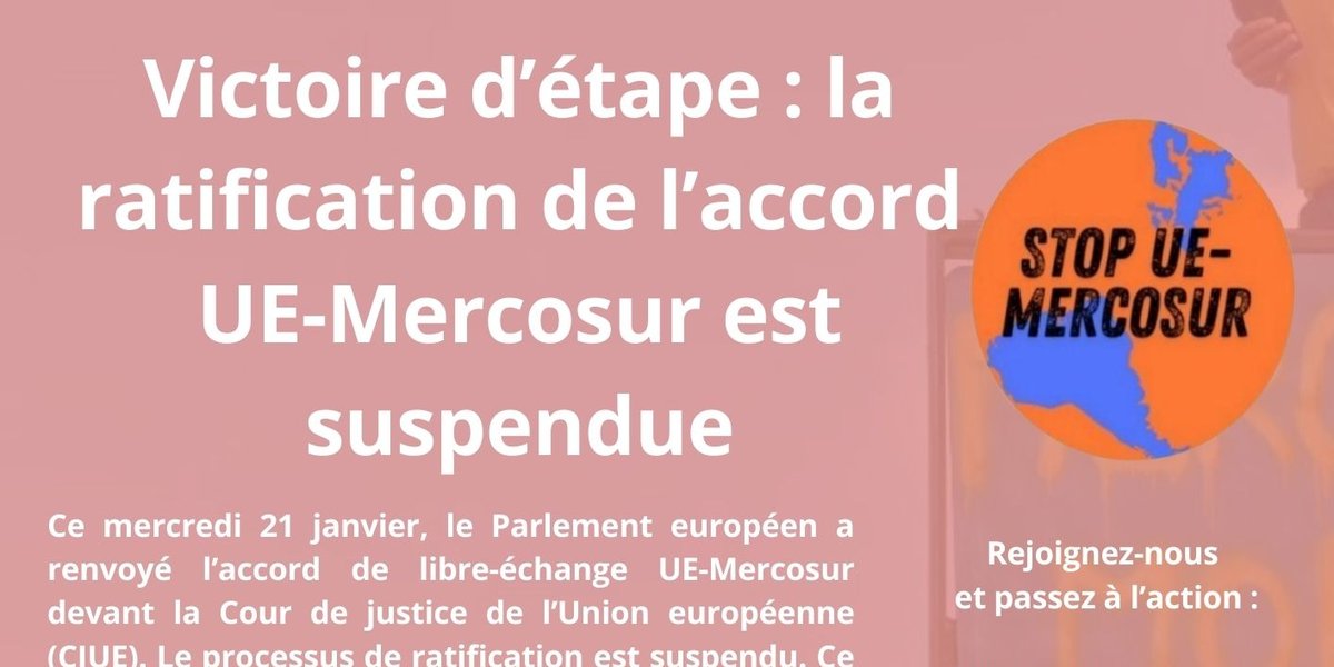 Ce mercredi 21 janvier, le Parlement européen s’est prononcé en faveur de la résolution qui renvoie l’accord de libre-échange entre l’UE et les pays du Mercosur devant la Cour de justice de l’Union européenne (CJUE) : 334 eurodéputés ont voté POUR ce renvoi, 324 CONTRE. Le processus de ratification européen est suspendu. Ce vote est le fruit des mobilisations paysannes et citoyennes menées depuis des années. Nous remercions les milliers de personnes qui ont écrit aux Eurodéputés pour leur demander de renvoyer cet accord devant la CJUE.