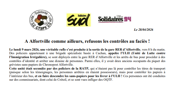 Des policiers appartenant à une brigade spécialisée basée à Cachan, appelée l’ULII (Unité de Lutte contre l’Immigration Irrégulière), se sont déployés entre la gare RER d’Alfortville et les arrêts de bus pour procéder à des contrôles d’identité et arrêter une dizaine de personnes.