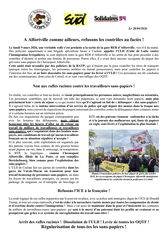 Non aux rafles racistes contre les travailleurs sans-papiers !