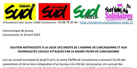 Les syndicats SUD PTT, SUD éducation et SUD rail membres de l'Union syndicale Solidaires 11 apportent tout leur soutien à la LDH de Carcassonne et aux journalistes de la presse locale qui informent le public de ce que fait le FN/RN.