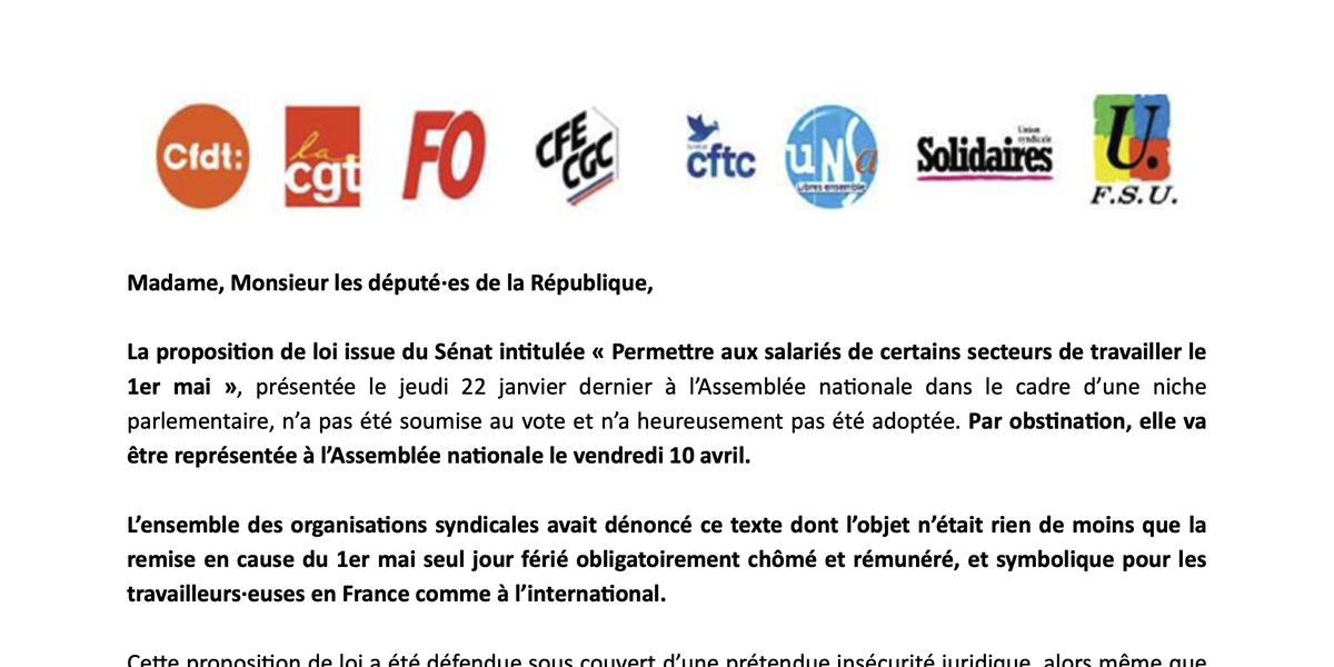 Les organisations syndicales CFDT, CGT, FO, CFE-CGC, CFTC, UNSA, Solidaires et FSU vous appellent donc solennellement à vous opposer à toute tentative de remise en cause du 1er mai et à le réaffirmer en rejetant la proposition de loi présentée le 10 avril 2026.