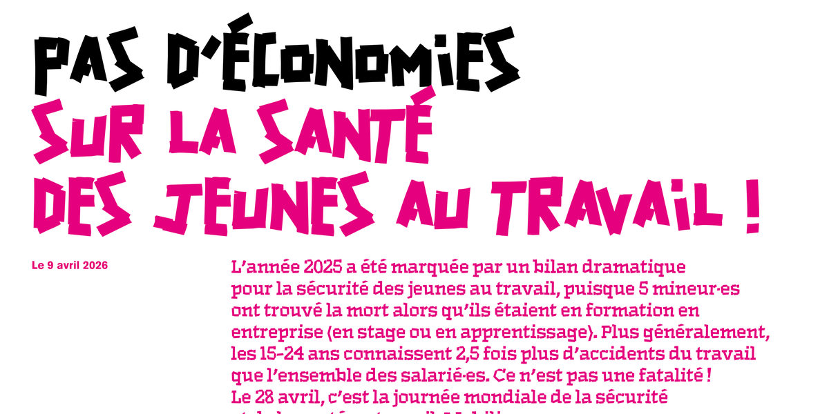 L’année 2025 a été marquée par un bilan dramatique pour la sécurité des jeunes au travail, puisque 5 mineur·es ont trouvé la mort alors qu’ils étaient en formation en entreprise (en stage ou en apprentissage). Plus généralement, les 15-24 ans connaissent 2,5 fois plus d'accidents du travail que l’ensemble des salarié∙es. Ce n’est pas une fatalité ! Le 28 avril, c’est la journée mondiale de la sécurité et de la santé au travail. Mobilisons-nous pour une réglementation protectrice !