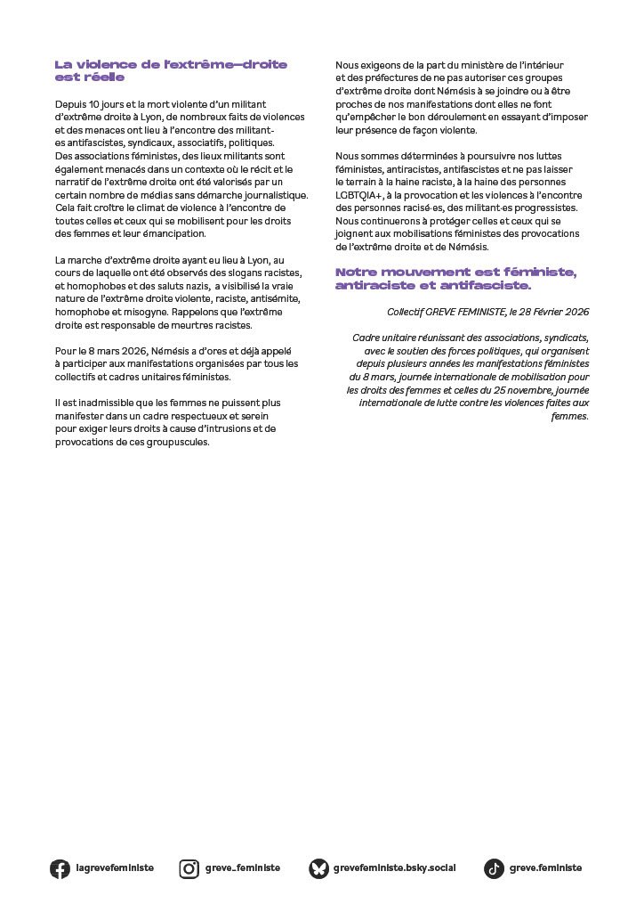 Collectif GREVE FEMINISTE, le 28Février 2026 – Cadre unitaire réunissant des associations, syndicats, avec le soutien des forces politiques, qui organisent depuis plusieurs années les manifestations féministes du 8 mars, journée internationale de mobilisation pour les droits des femmes et celles du 25 novembre, journée internationale de lutte contre les violences faites aux femmes.