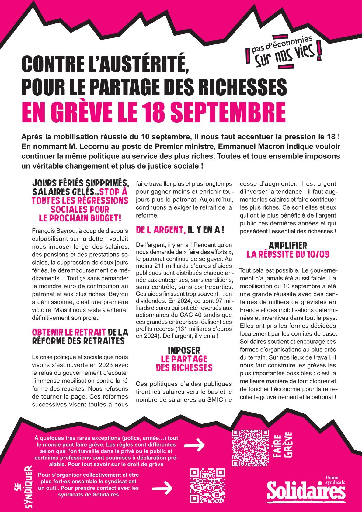 Après la mobilisation réussie du 10 septembre, il nous faut accentuer la pression le 18 !