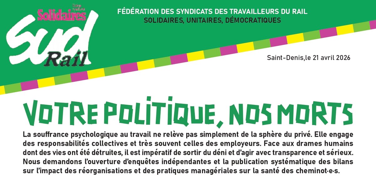 La souffrance psychologique au travail ne relève pas simplement de la sphère du privé. Elle engage des responsabilités collectives et très souvent celles des employeurs. Face aux drames humains dont des vies ont été détruites, il est impératif de sortir du déni et d’agir avec transparence et sérieux. Nous demandons l’ouverture d’enquêtes indépendantes et la publication systématique des bilans sur l’impact des réorganisations et des pratiques managériales sur la santé des cheminot·e·s.
