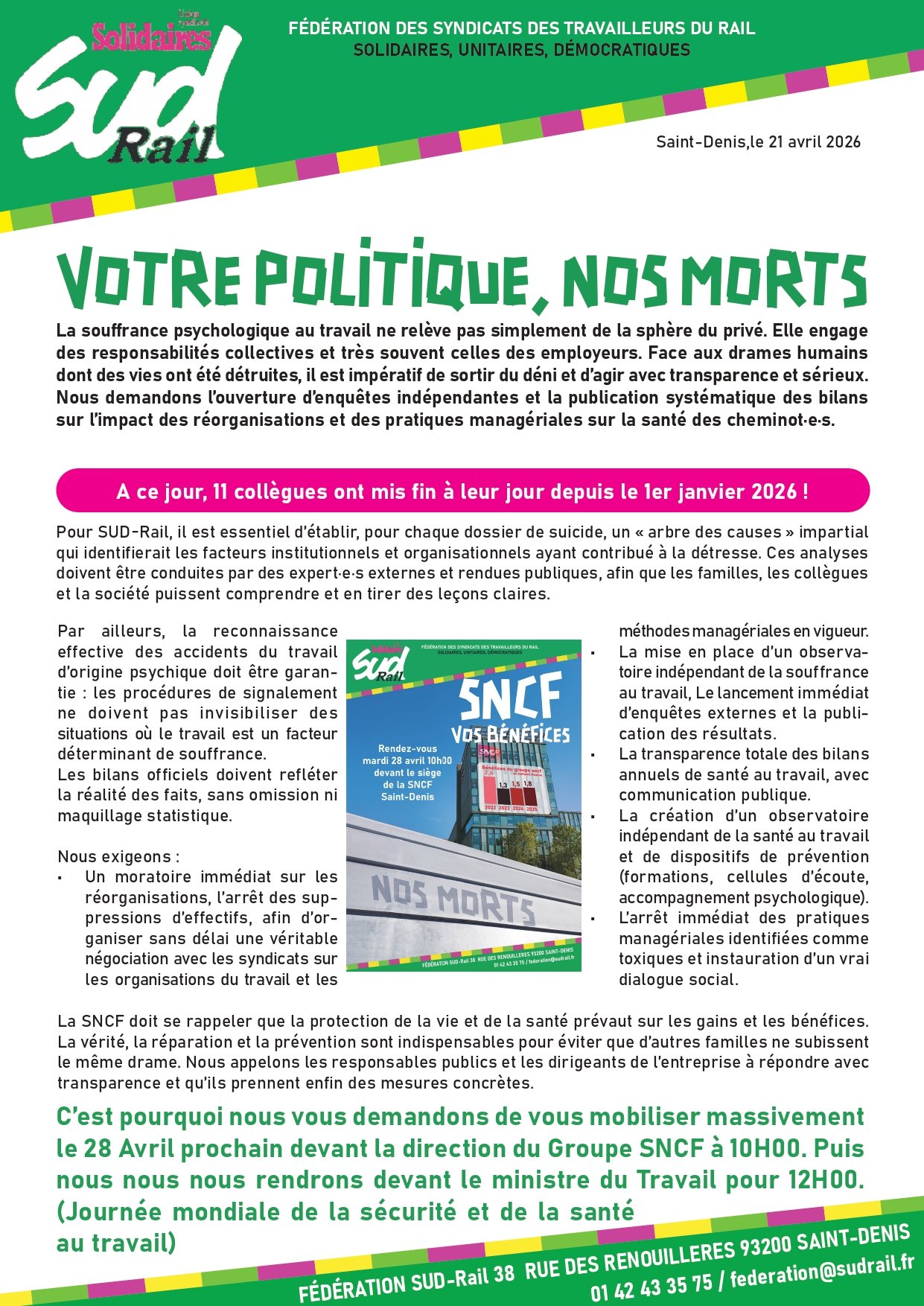 C’est pourquoi nous appellons à une mobilisation massive le 28 Avril prochain devant la direction du Groupe SNCF à 10H00. Puis nous nous nous rendrons devant le ministre du Travail pour 12H00. (Journée mondiale de la sécurité et de la santé au travail)