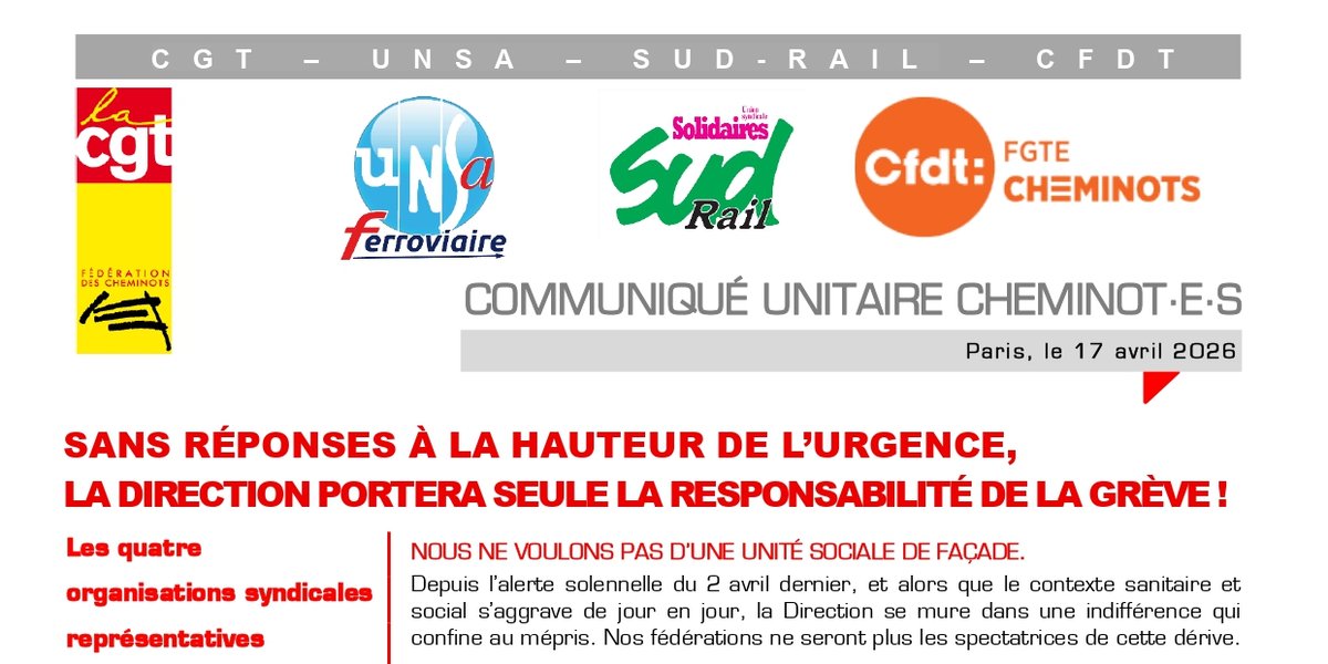 Les quatre organisations syndicales représentatives CGT Cheminots, UNSAFerroviaire, SUD-Rail, CFDT cheminots se sont réunies en interfédérale le 14 avril 2026. Elles actent une rupture majeure avec la Direction qui refuse d’entendre la souffrance des cheminot·e·s, et décident d’engager le rapport de force.