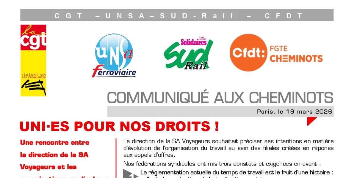 Une rencontre entre la direction de la SA Voyageurs et les organisations syndicales a eu lieu le mercredi 18 mars. Cette réunion s’est tenue en présence de la DRH Groupe.
