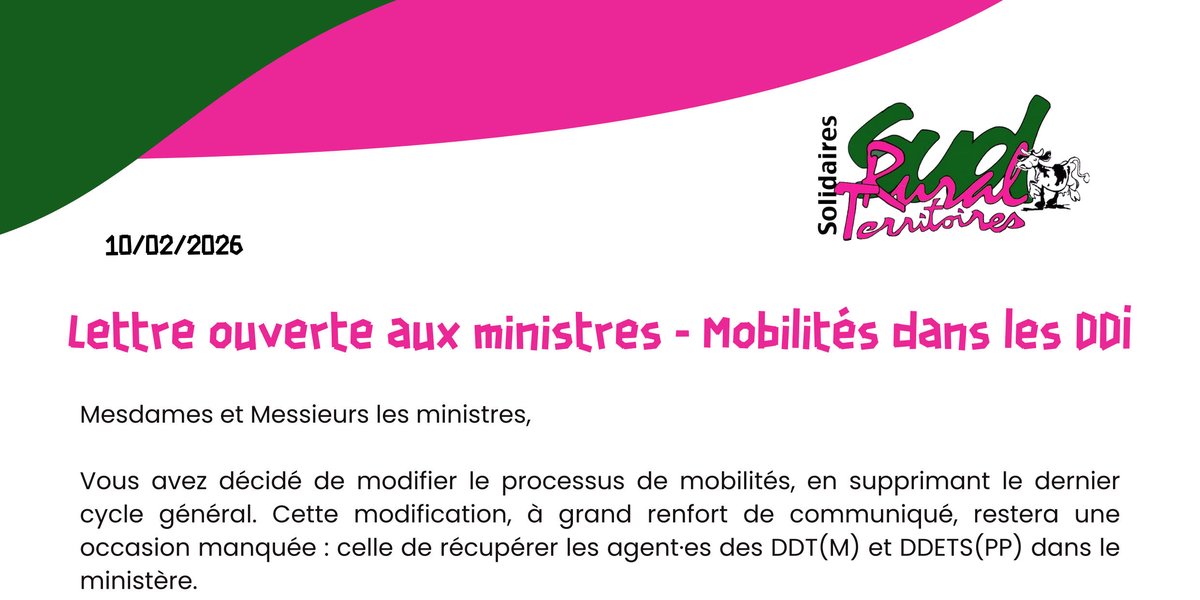 Vous avez décidé de modifier le processus de mobilités, en supprimant le dernier cycle général. Cette modification, à grand renfort de communiqué, restera une occasion manquée : celle de récupérer les agent·es des DDT(M) et DDETS(PP) dans le ministère.