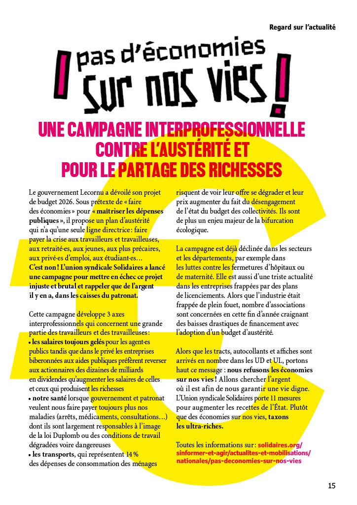Alors que les tracts, autocollants et affiches sont arrivés en nombre dans les UD et UL, portons haut ce message : nous refusons les économies sur nos vies ! Allons chercher l’argent où il est afin de nous garantir une vie digne. L’Union syndicale Solidaires porte 11 mesures pour augmenter les recettes de l'État. Plutôt que des économies sur nos vies, taxons les ultra-riches.
