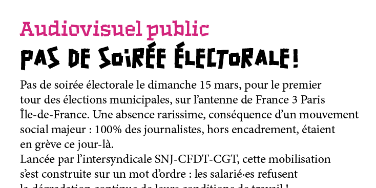 Pas de soirée électorale le dimanche 15 mars, pour le premier tour des élections municipales, sur l’antenne de France 3 Paris Île-de-France. Une absence rarissime, conséquence d’un mouvement social majeur : 100% des journalistes, hors encadrement, étaient en grève ce jour-là.