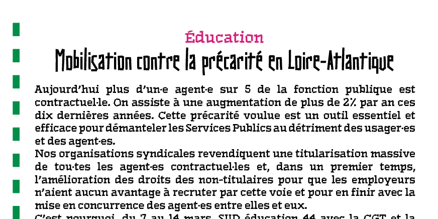 C’est pourquoi, du 7 au 14 mars, SUD éducation 44 avec la CGT et la FSU organisent une semaine de mobilisation contre la précarité. Cette semaine vise à visibiliser les conditions de travail de nos collègues précaires : AESH, AED, contractuel.les, non titulaires, BIATSS, personnels administratif·ves. Nous appelons l’ensemble de la communauté éducative à se mobiliser pour soutenir nos collègues. Nous revendiquons un meilleur statut, un meilleur salaire, une formation de qualité et des pôles de remplacement efficients. L’interpro de la fonction publique nous rejoint dans cette lutte, notamment les finances publiques, l’hôpital et la territoriale.