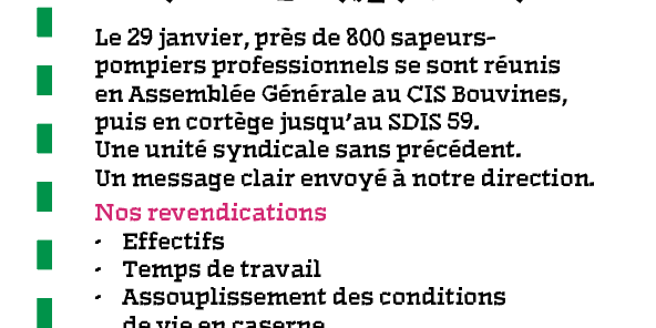 Le 29 janvier, près de 800 sapeurs-pompiers professionnels se sont réunis en Assemblée Générale au CIS Bouvines, puis en cortège jusqu’au SDIS 59. Une unité syndicale sans précédent. Un message clair envoyé à notre direction.