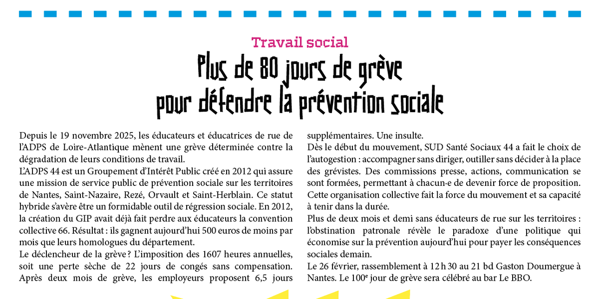 Depuis le 19 novembre 2025, les éducateurs et éducatrices de rue de l’ADPS de Loire-Atlantique mènent une grève déterminée contre la dégradation de leurs conditions de travail.