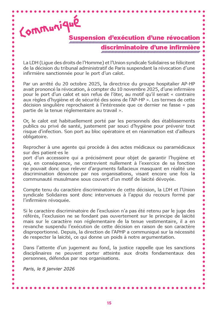 La LDH (Ligue des droits de l’Homme) et l’Union syndicale Solidaires se félicitent de la décision du tribunal administratif de Paris suspendant la révocation d’une infirmière sanctionnée pour le port d’un calot.
