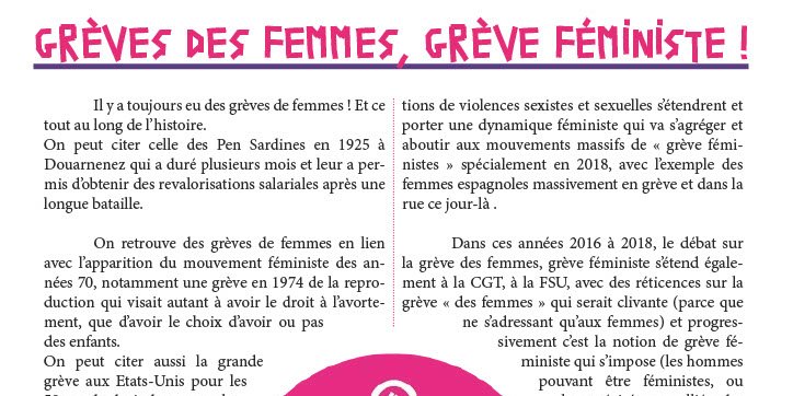 La grève féministe fait le focus sur l’idée que sans les femmes le monde s’arrête. L’épisode Covid a mis en avant les métiers essentiels très largement occupés par des femmes (et des personnes issues de l’immigration), les premières de corvée. L’enjeu porte évidemment sur la grève du travail dit productif, mais aussi sur le travail « reproductif » dévolue aux femmes (tâches domestiques, éducation des enfants, soins des proches…), qui permet au capitalisme de fonctionner, et qu’il est important de reconnaître car étant fondamental parce qu’il sert plus largement la vie, et l’habitabilité de la planète ! (voir le livre « Mobilisées » de Fany Gallot et Pauline Delage).