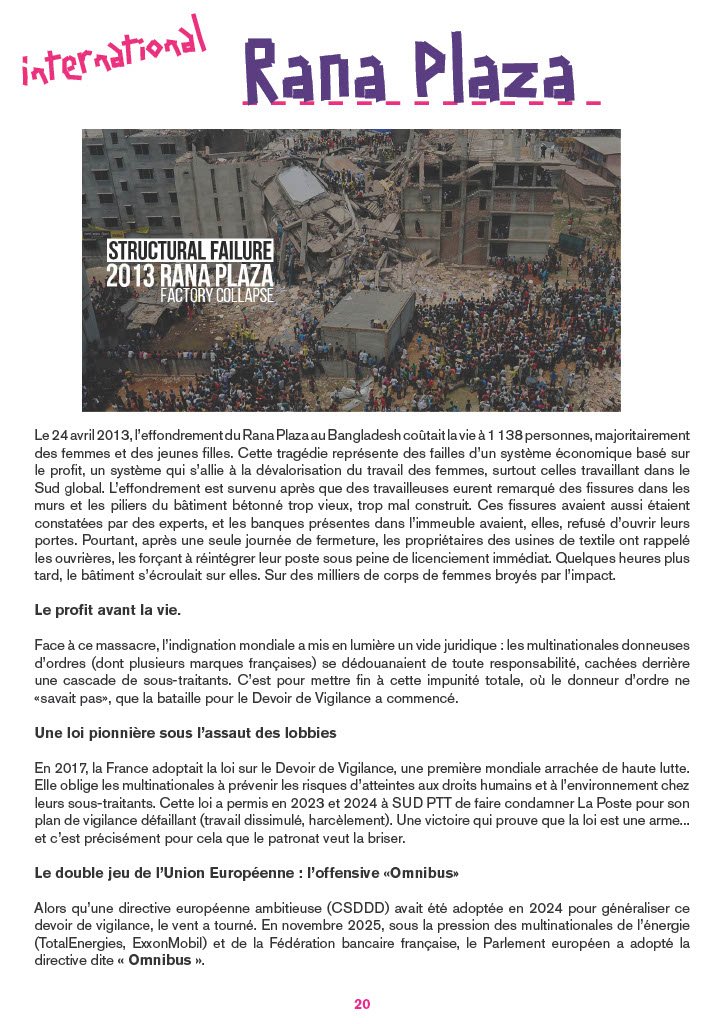 En 2017, la France adoptait la loi sur le Devoir de Vigilance, une première mondiale arrachée de haute lutte. Elle oblige les multinationales à prévenir les risques d’atteintes aux droits humains et à l’environnement chez leurs sous-traitants. Cette loi a permis en 2023 et 2024 à SUD PTT de faire condamner La Poste pour son plan de vigilance défaillant (travail dissimulé, harcèlement). Une victoire qui prouve que la loi est une arme... et c’est précisément pour cela que le patronat veut la briser.