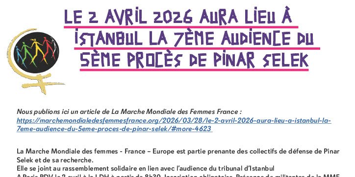 Nous publions ici un article de La Marche Mondiale des Femmes France : https://marchemondialedesfemmesfrance.org/2026/03/28/le-2-avril-2026-aura-lieu-a-istanbul-la-7eme-audience-du-5eme-proces-de-pinar-selek/#more-4623