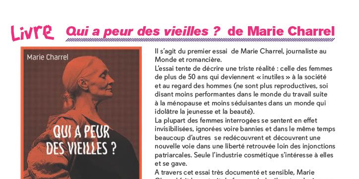 A travers cet essai très documenté et sensible, Marie Charrel fait le portrait de femmes indociles et audacieuses qui, avec les années (débarrassées de leur rôle de mère, de femme qui doivent rester jeunes et belles), sont enfin libres d’être tout simplement femmes.
