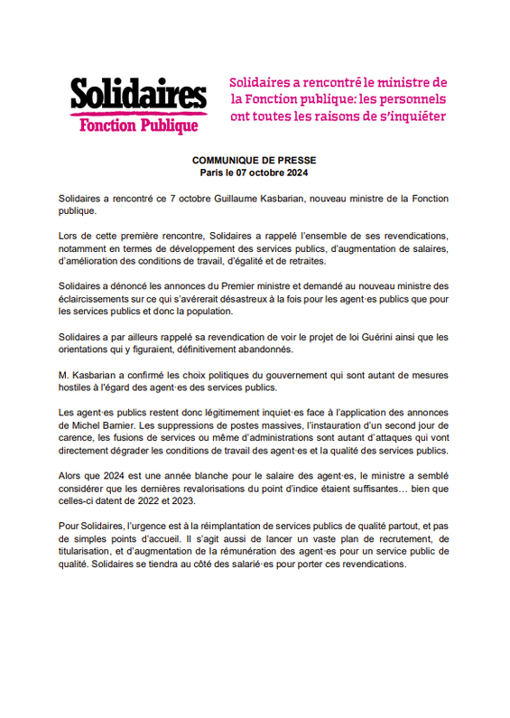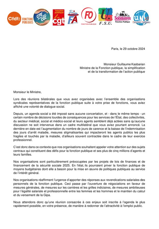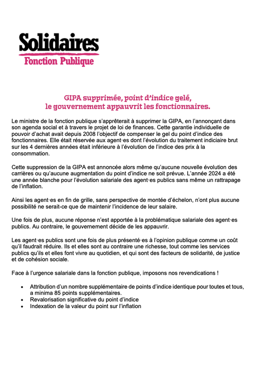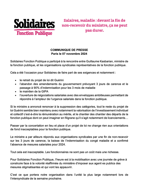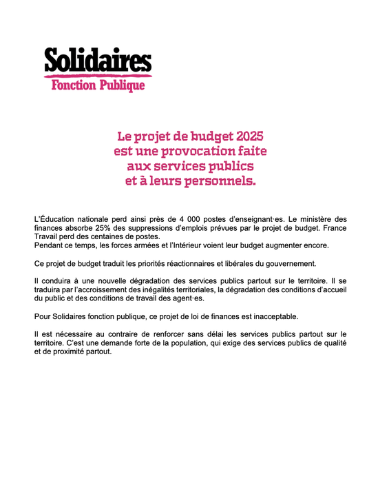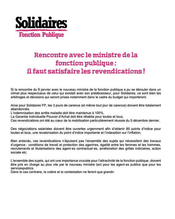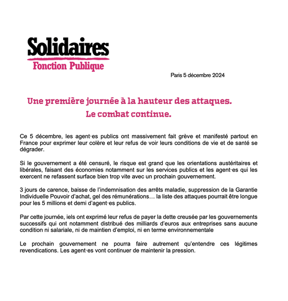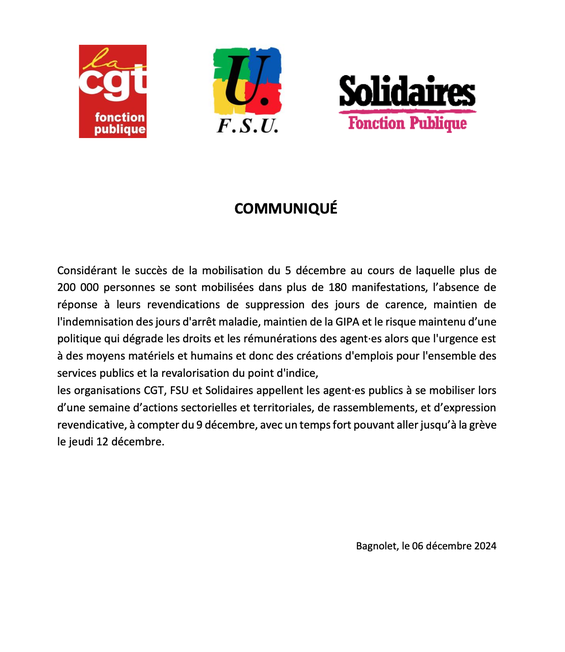 Communiqué CGT/FSU/SOLIDAIRES/UNSA Nous n’accepterons pas une année noire pour la Fonction publique et les agent·es publics en 2025 !
