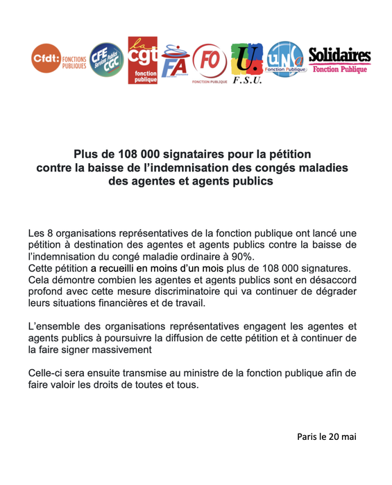 Plus de 108 000 signataires pour la pétition contre la baisse de l’indemnisation des congés maladies des agentes et agents publics