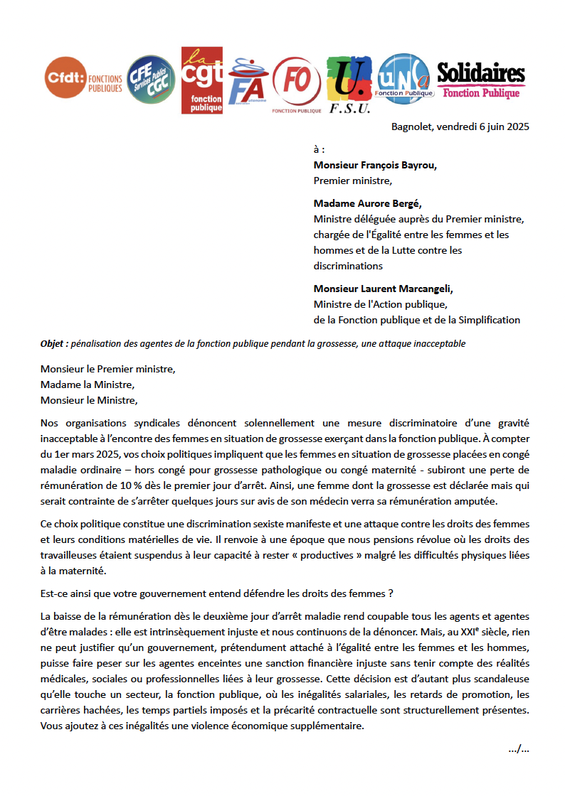 Lettre intersyndicale sur la pénalisation des agentes de la fonction publique pendant la grossesse