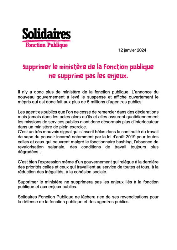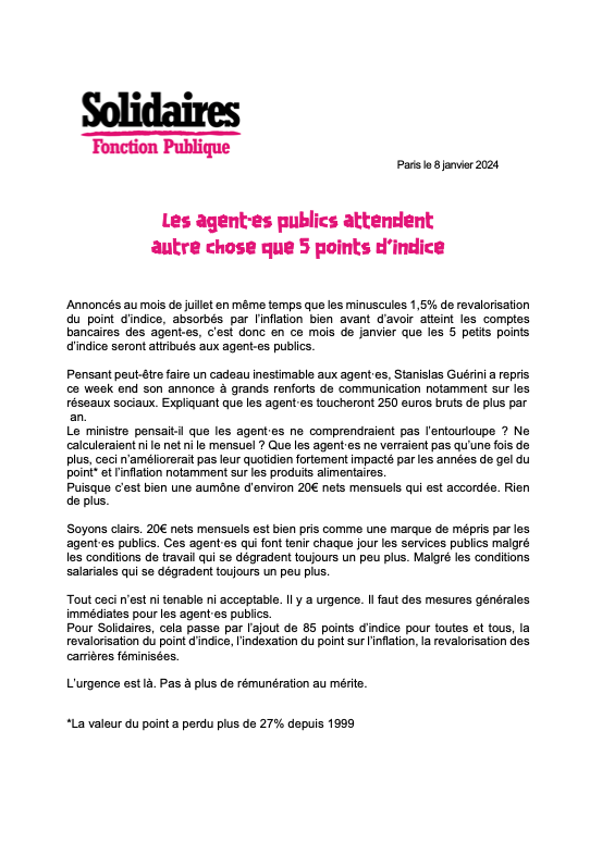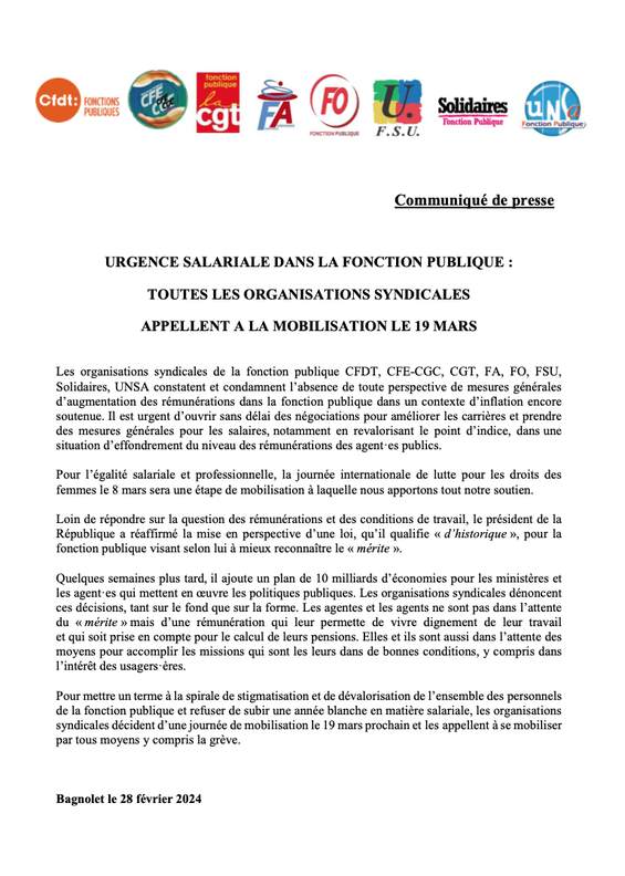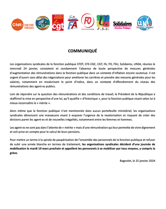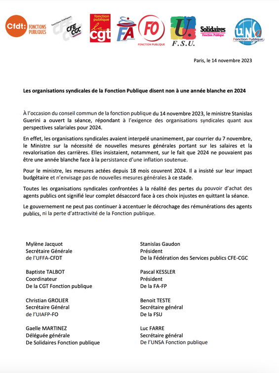 Les organisations syndicales de la Fonction Publique disent non à une année blanche en 2024