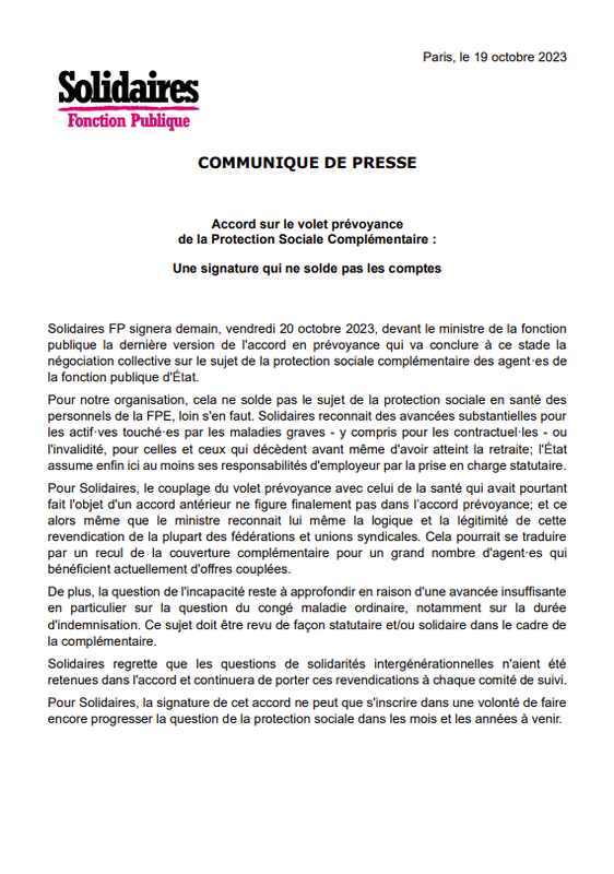 Déclaration Accord relatif au volet prévoyance de la protection sociale complémentaire dans la fonction publique de l’État.