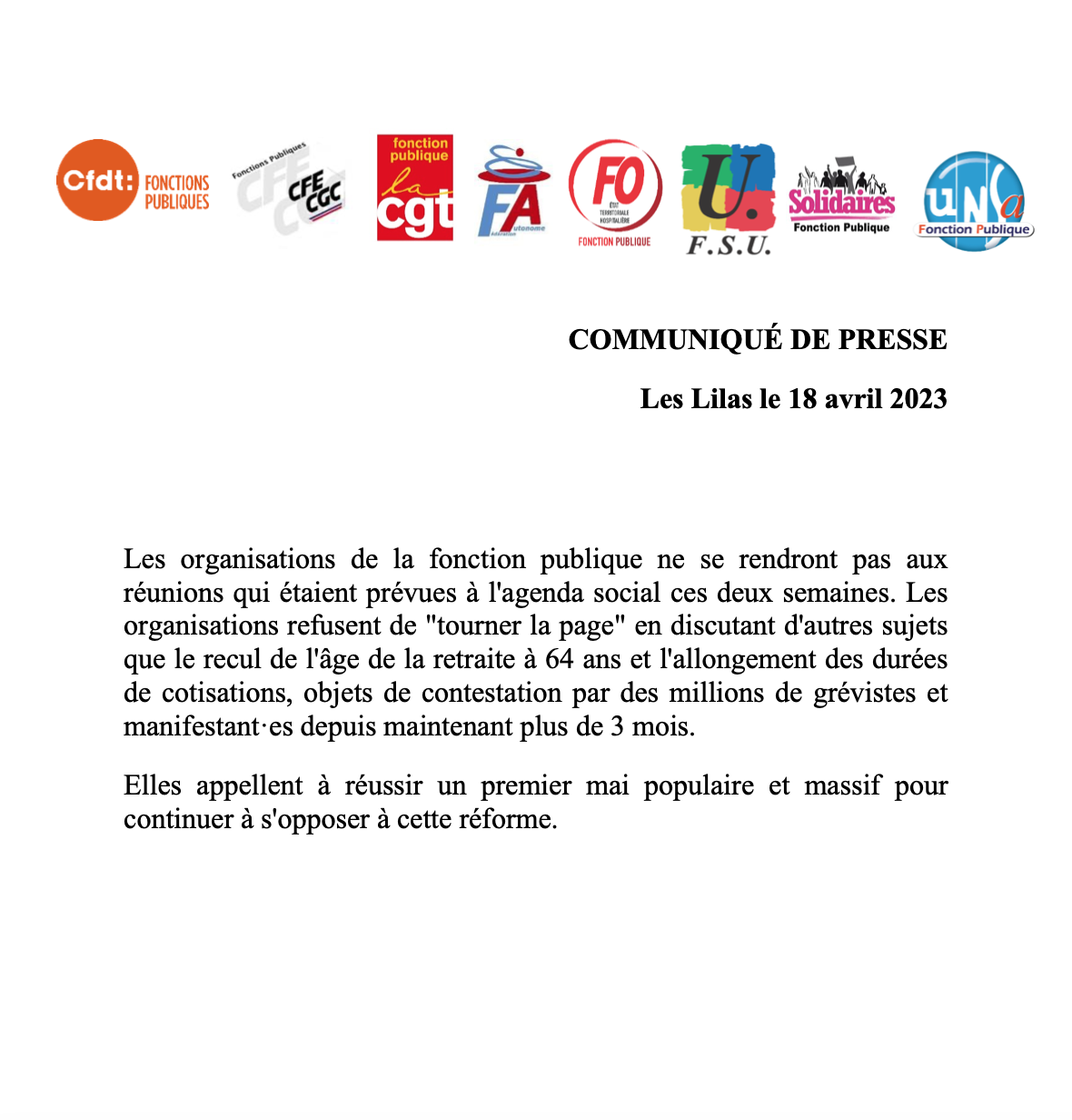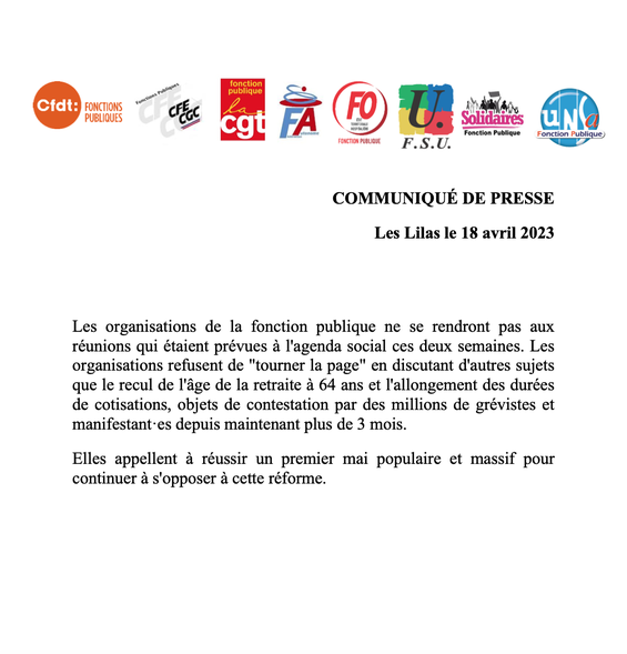 Les organisations de la fonction publique ne se rendront pas aux réunions qui étaient prévues à l'agenda social ces deux semaines. Les organisations refusent de "tourner la page" en discutant d'autres sujets que le recul de l'âge de la retraite à 64 ans et l'allongement des durées de cotisations, objets de contestation par des millions de grévistes et manifestant·es depuis maintenant plus de 3 mois.