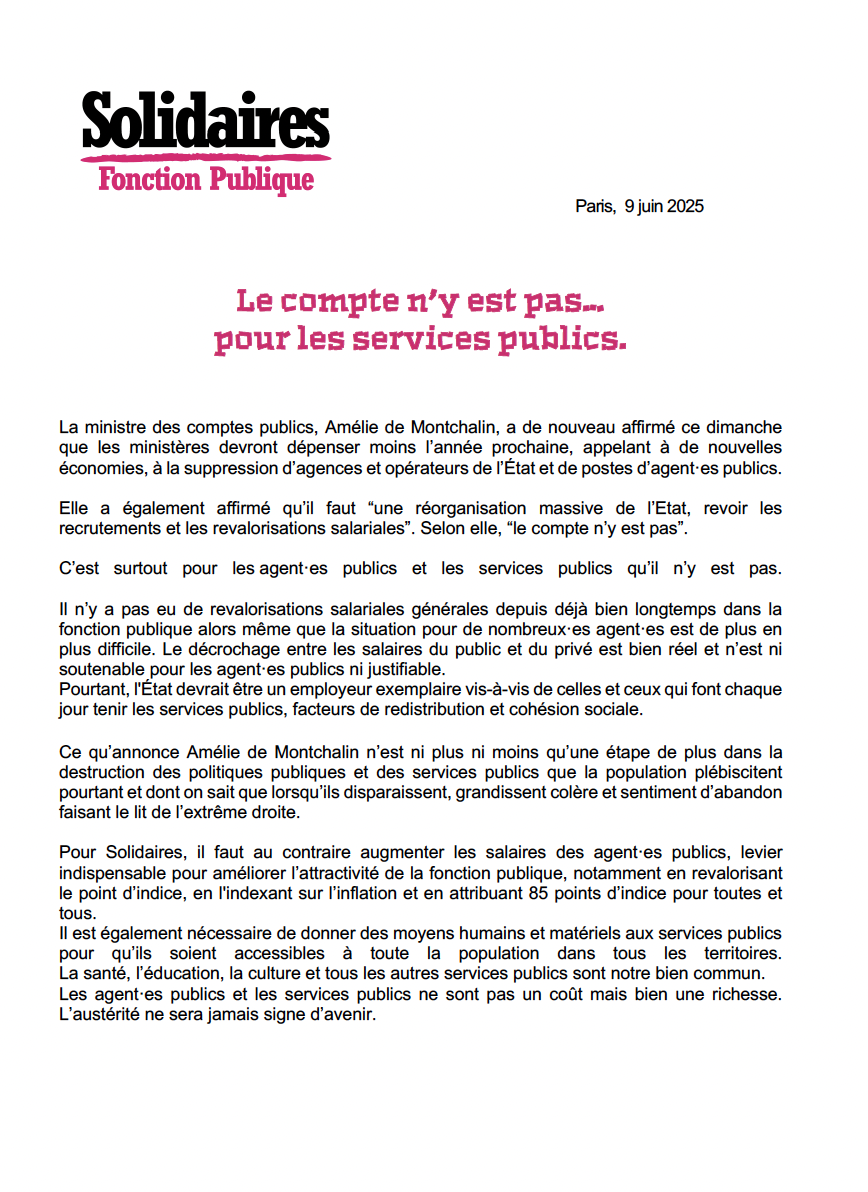Pour Solidaires, il faut au contraire augmenter les salaires des agent·es publics, levier indispensable pour améliorer l’attractivité de la fonction publique, notamment en revalorisant le point d’indice, en l'indexant sur l’inflation et en attribuant 85 points d’indice pour toutes et tous.