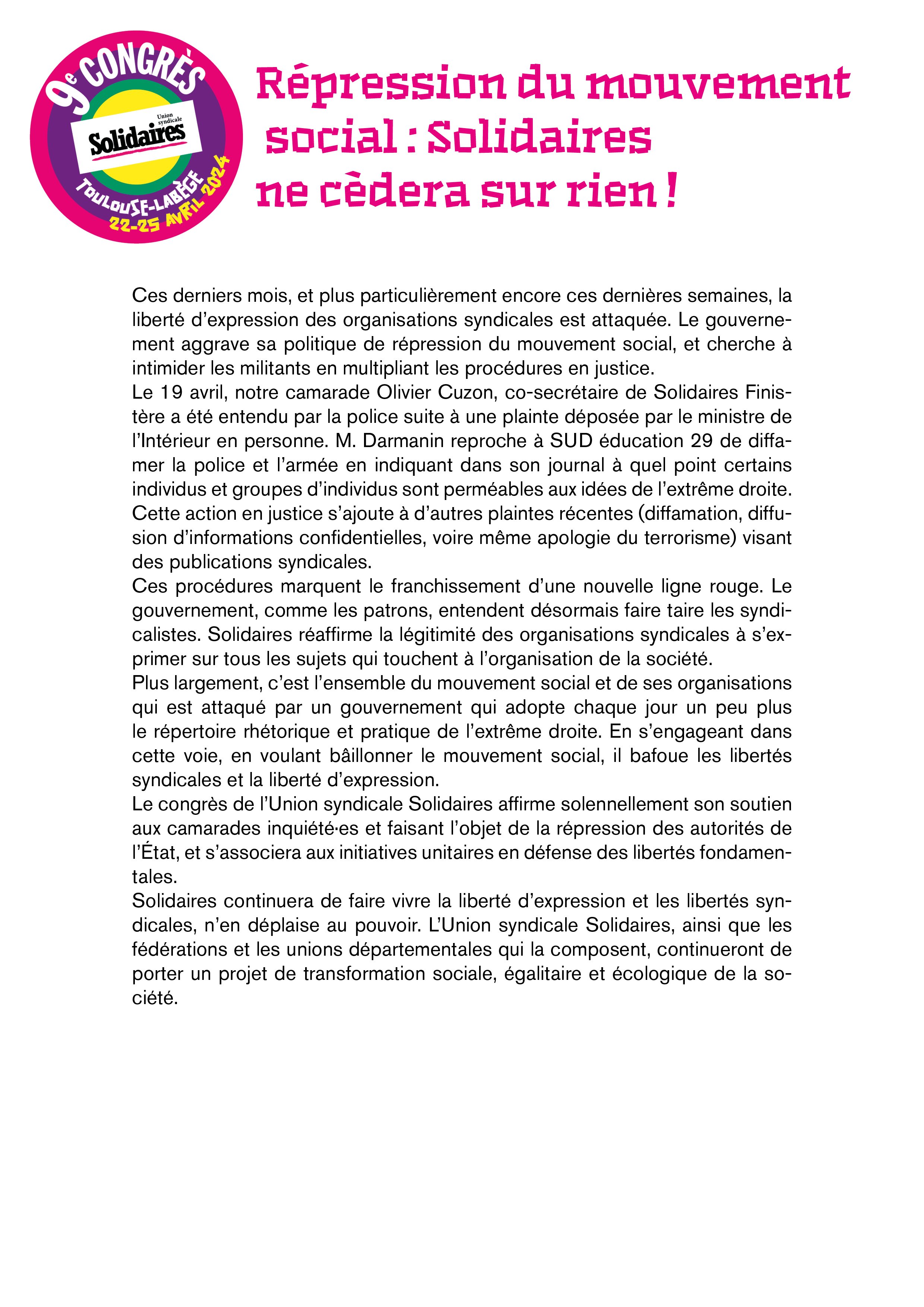 Le congrès de l’Union syndicale Solidaires affirme solennellement son soutien aux camarades inquiété·es et faisant l’objet de la répression des autorités de l’État, et s’associera aux initiatives unitaires en défense des libertés fondamentales.