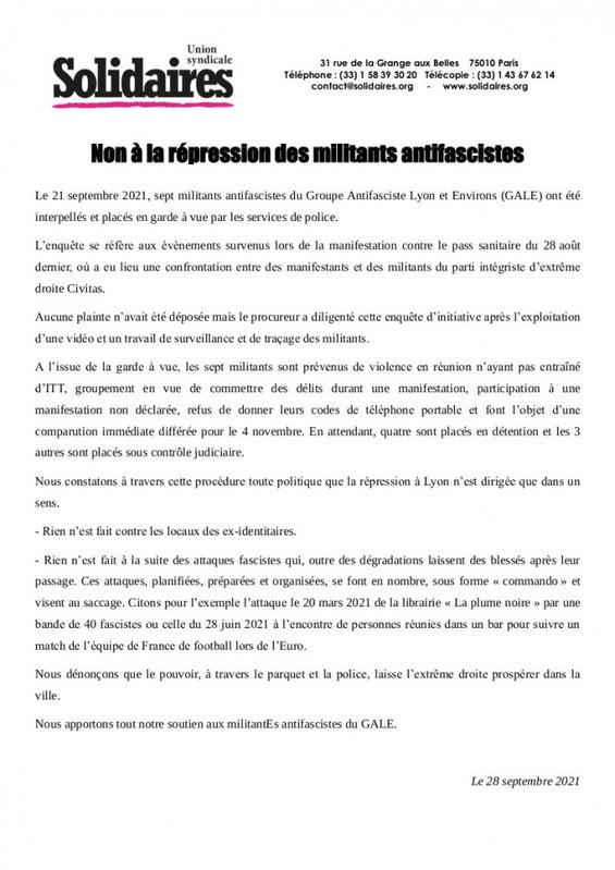 Solidaires 73 et 74 : FACE AUX VIOLENCES D’EXTRÊME DROITE : RIPOSTE IMMEDIATE