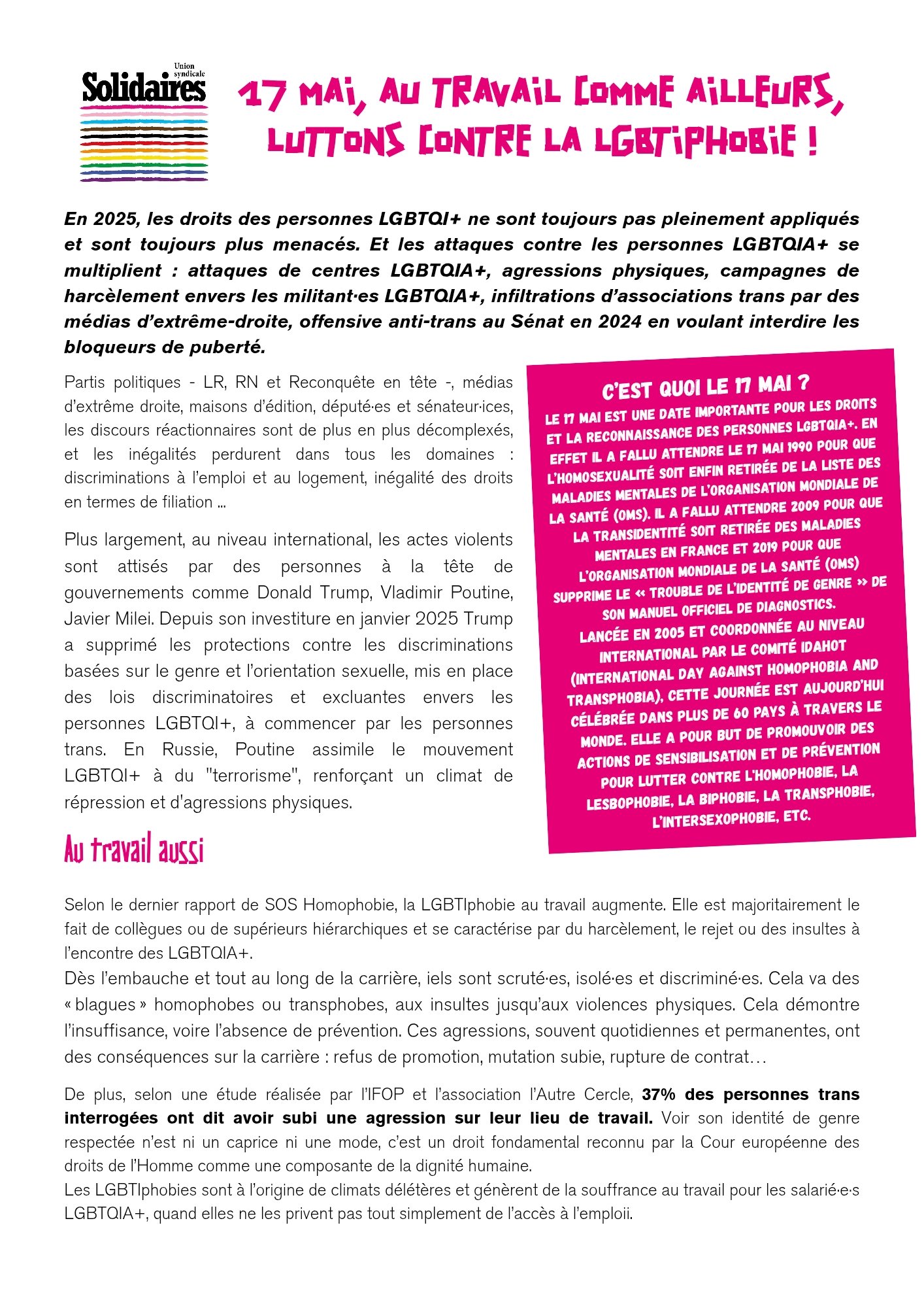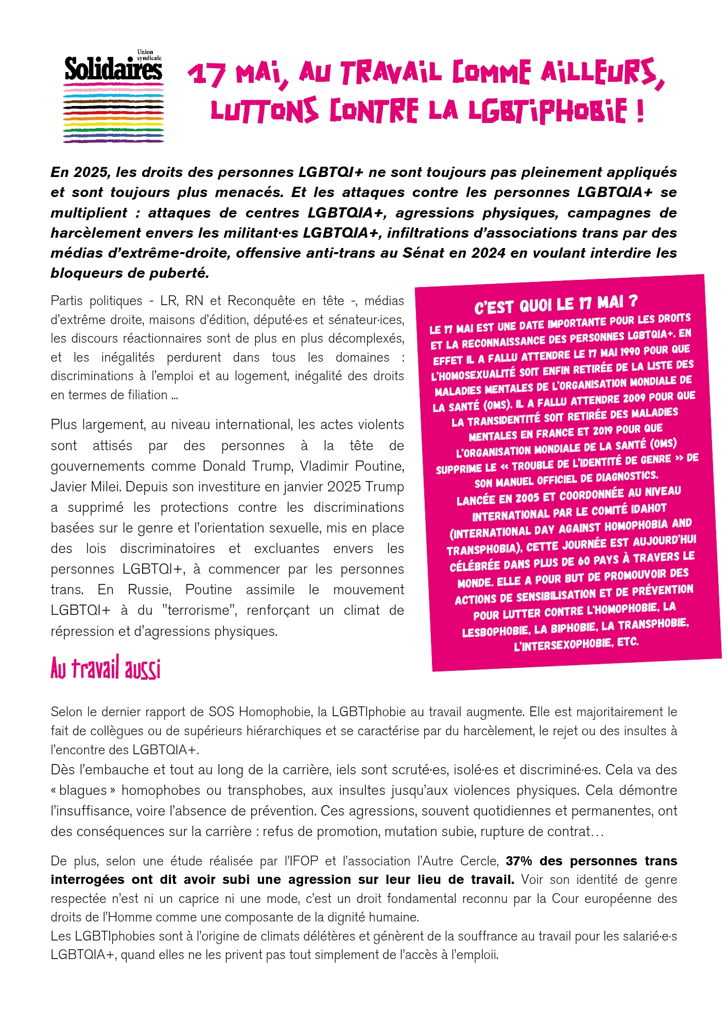 Il est urgent de mettre en place une négociation annuelle obligatoire, des outils effectifs et contraignants de lutte contre les discriminations, de suivi et prévention des discriminations, du harcèlement, mais aussi, de former et sensibiliser les salarié∙es et les directions sur ces questions afin d’obtenir l’égalité des droits et des environnements de travail inclusifs, sans stéréotypes de genre, ainsi que des mesures concrètes contre les violences au travail.